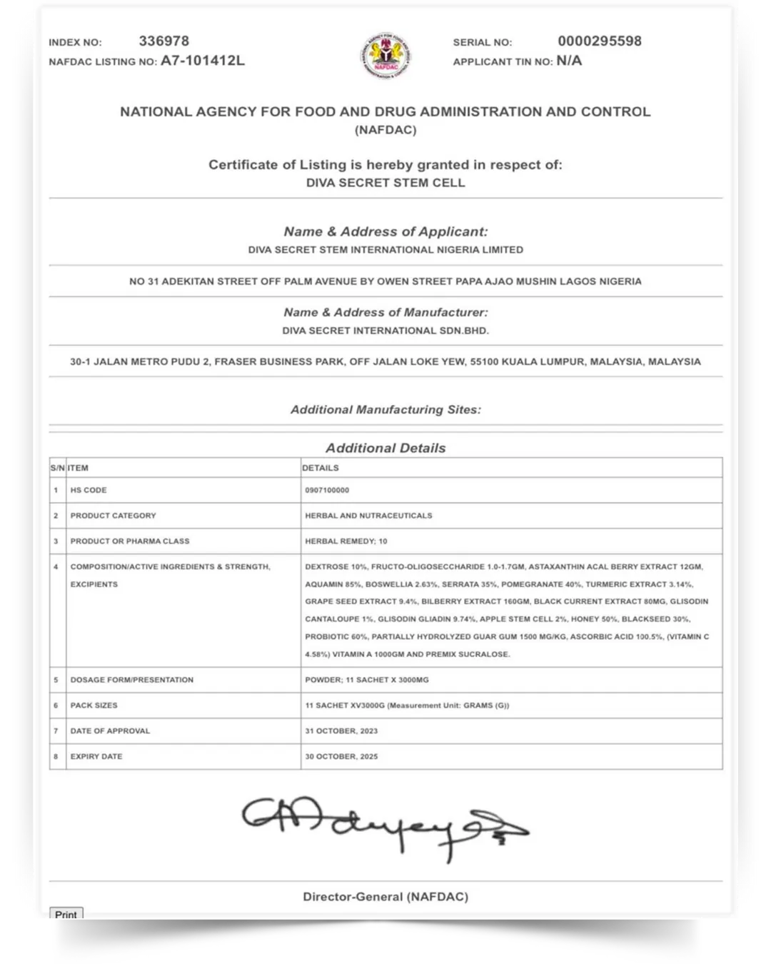 NAFDAC Certification means the product has passed the regulatory standards for food, drugs, and supplements in Nigeria. This approval indicates that the product is considered safe for Nigerian consumers, adheres to local quality and safety standards, and can be marketed in the Nigerian market. NAFDAC certification can also be a marker of quality and Good Manufacturing Practices (GMP).