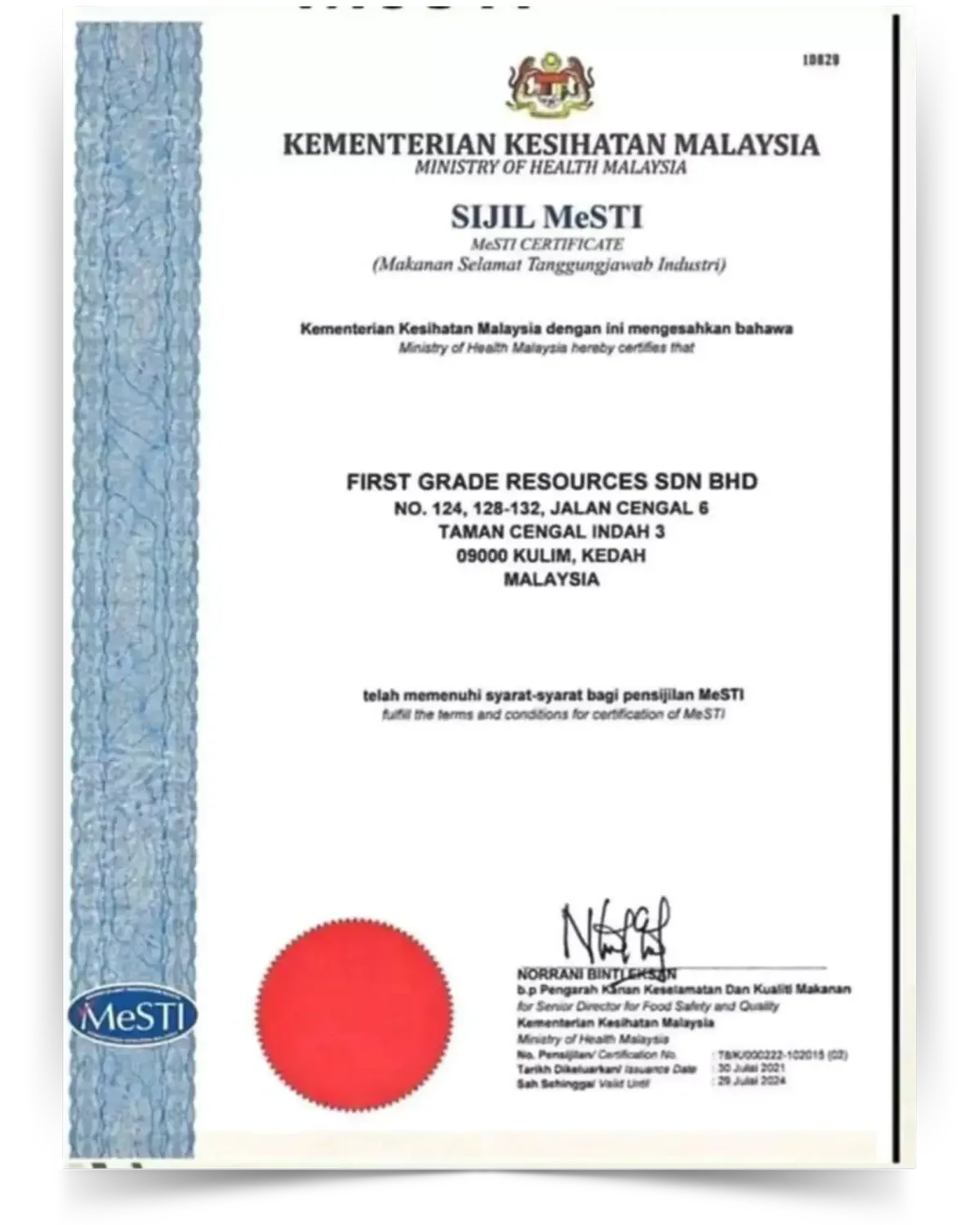 MeSTI Certification is a Malaysian government initiative that ensures food safety and hygiene for manufacturers. This means the product has been produced under sanitary and controlled conditions in compliance with Malaysian food safety laws. It indicates that the product is safe to consume, meets hygiene standards, and is produced following Good Manufacturing Practices (GMP) specific to Malaysia’s requirements.